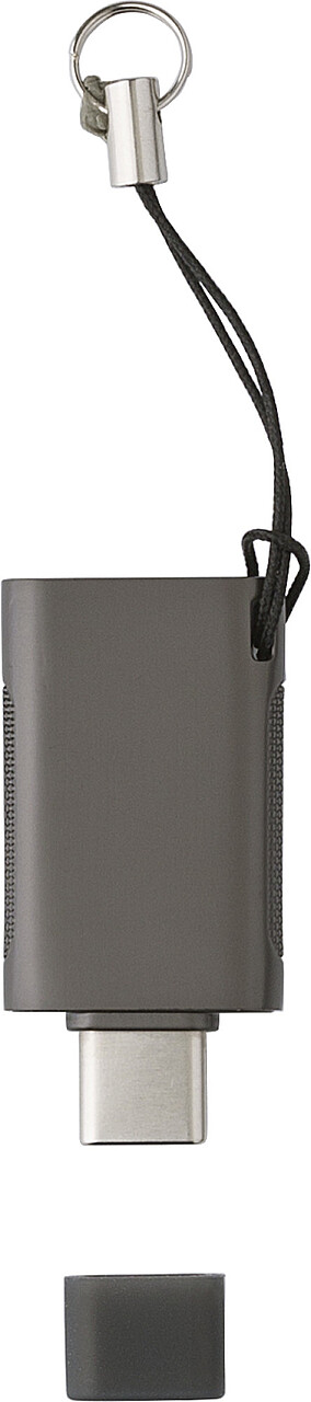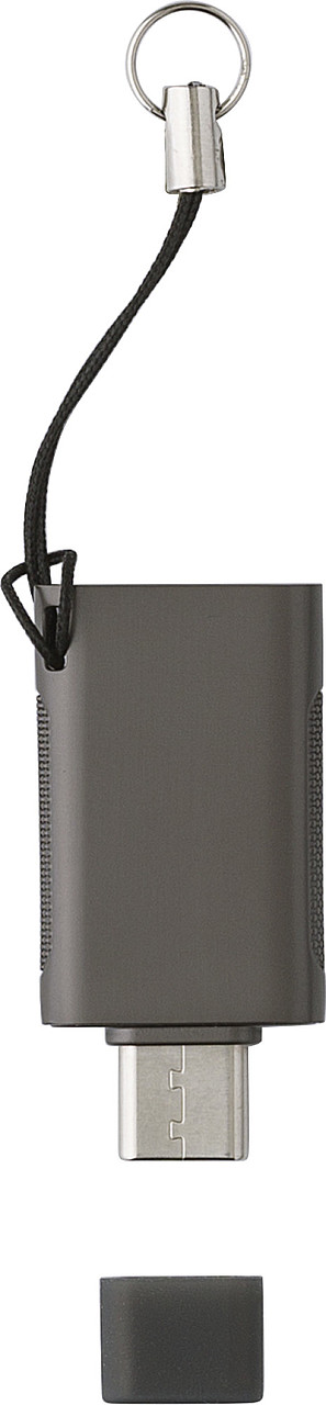 Otočný USB flash disk vyrobený ze zinkové slitiny s matným grafitovým povrchem a šňůrkou. Kapacita 64 GB, s otočnou funkcí pro USB-A a USB-C. Baleno v sáčku a krabičce. Rozměry: 3,6 × 1,9 × 0,6 cm. Cena nezahrnuje recyklační poplatek a autorskou odměnu.