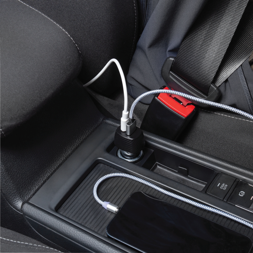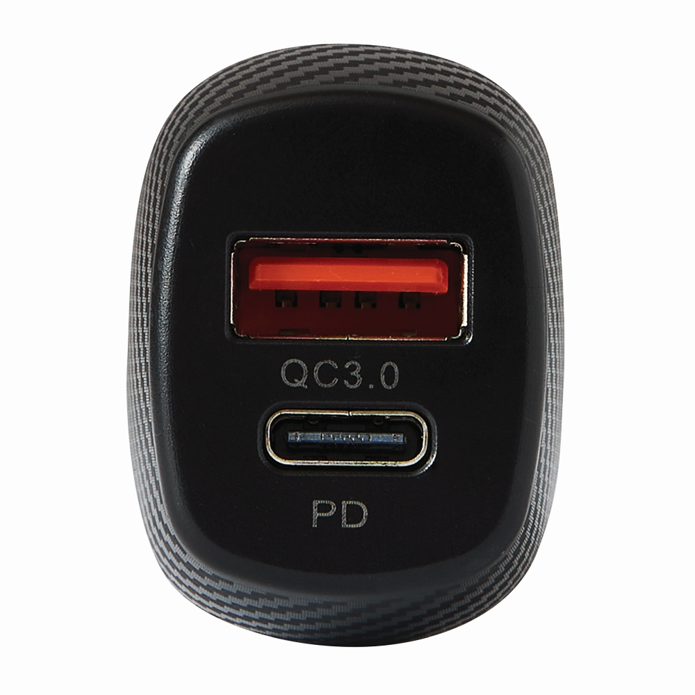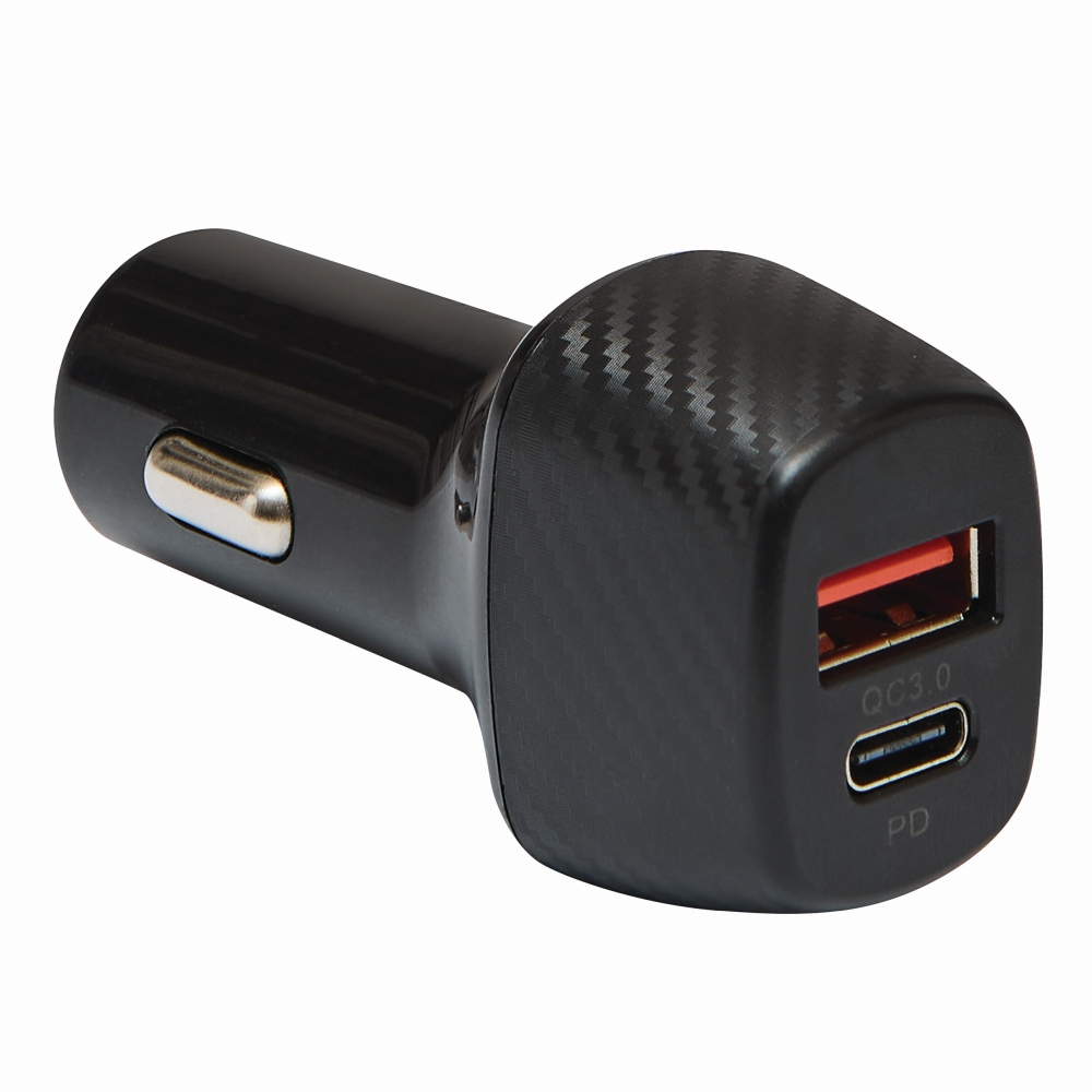 USB adaptér, ideální do auta: 12- a 24-voltové připojení pro zapalovač cigaret, 1 port USB Type-A a 1 port USB Type-C, celkový výstupní výkon max. 20 W, podporuje rychlé nabíjení a napájení. Rozměry: 6,7 x 3,5 x 2,5 cm