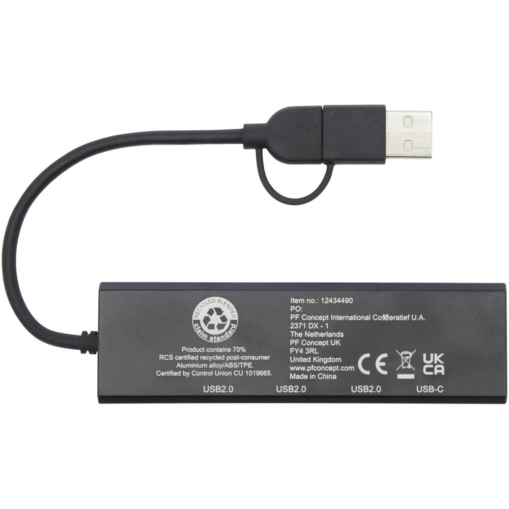 Rozbočovač USB 2.0 vyrobený z recyklovaného hliníku RCS s elegantním obdélníkovým krytem z recyklovaného hliníku. Disponuje 3x USB 2.0 porty a 1x Typ-C PD (Power Delivery) portem, který umožňuje přenášet data s přenosovou rychlostí až 480 Mbps. Přiložený vstupní adaptér Typ-C vám umožňuje používat toto zařízení s notebooky a počítači vybavenými USB-A a Typ-C. Dodáváno v prémiové krabičce ze 100% recyklovaného kraftového papíru s barevnou samolepkou. Rozměry: 10 x 1,2 x 3 cm.