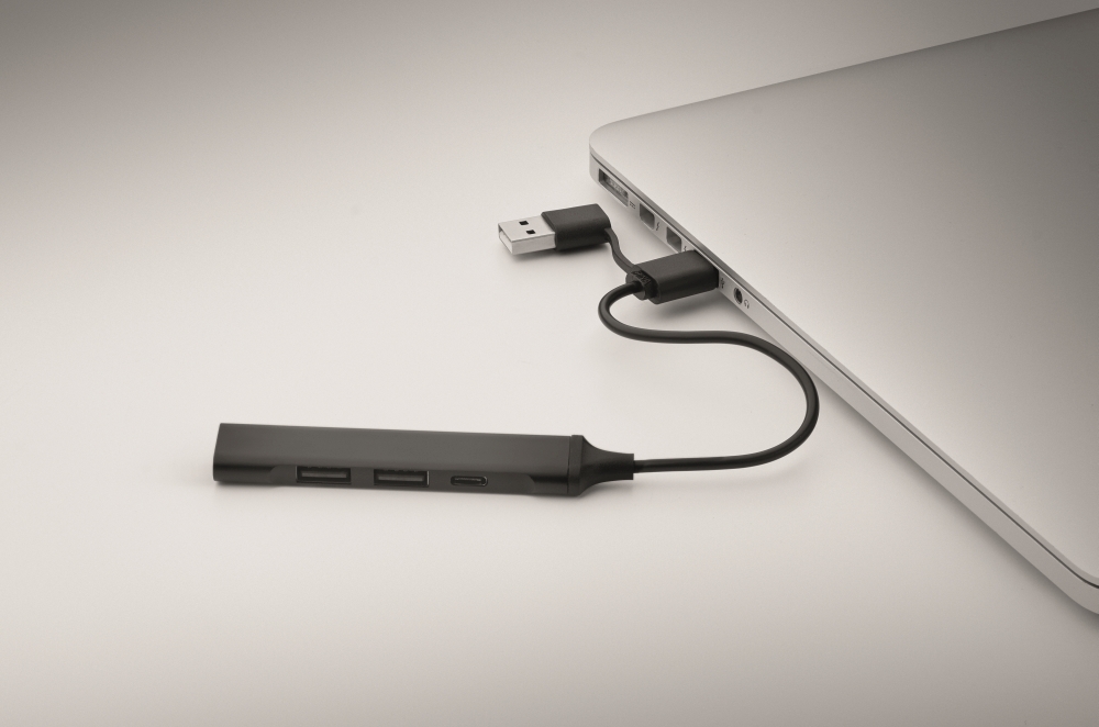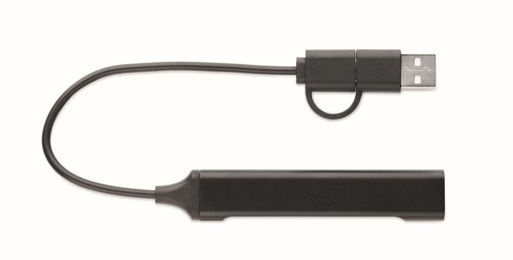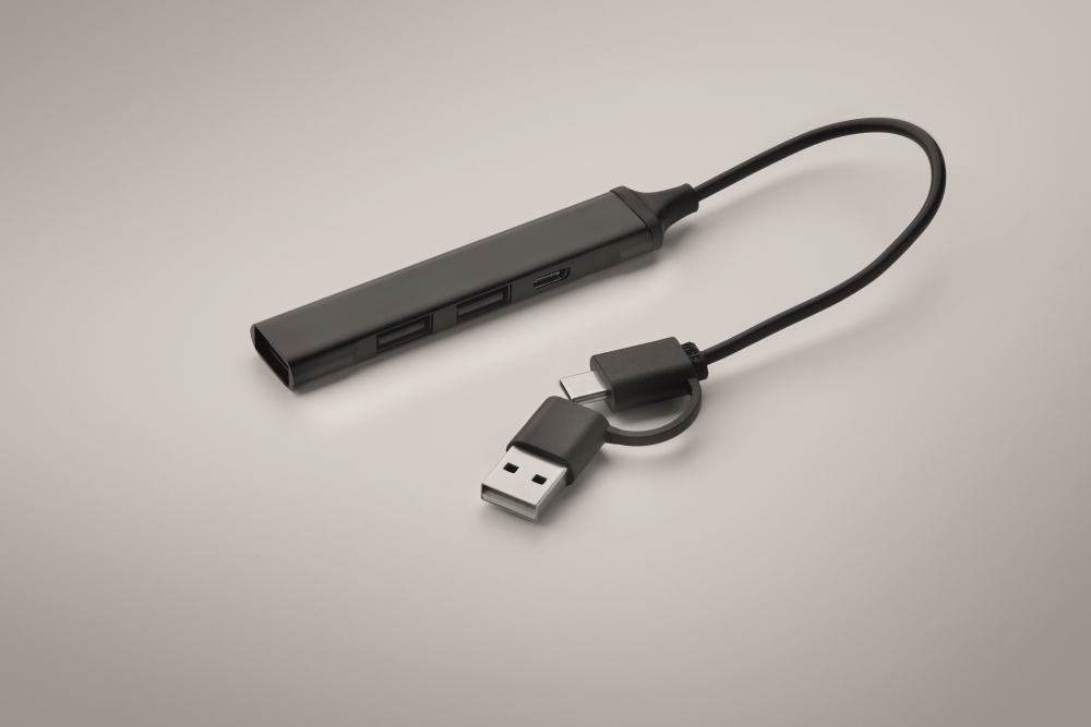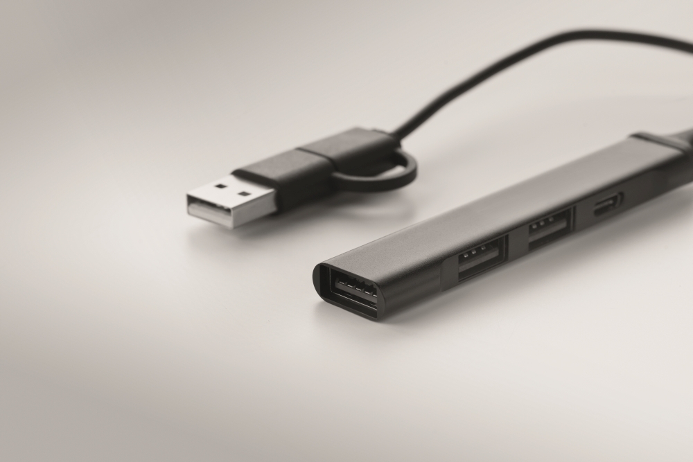 Rozbočovač USB se 4 porty. Vyrobeno z recyklovaného hliníku. 3 USB-A + 1 Type-C. Vstup: 2v1: Type-C a Type-A. Délka kabelu: 19 cm. Rozměry: 1,7 x 0,7 x 9,5 cm. Materiál: recyklovaný hliník