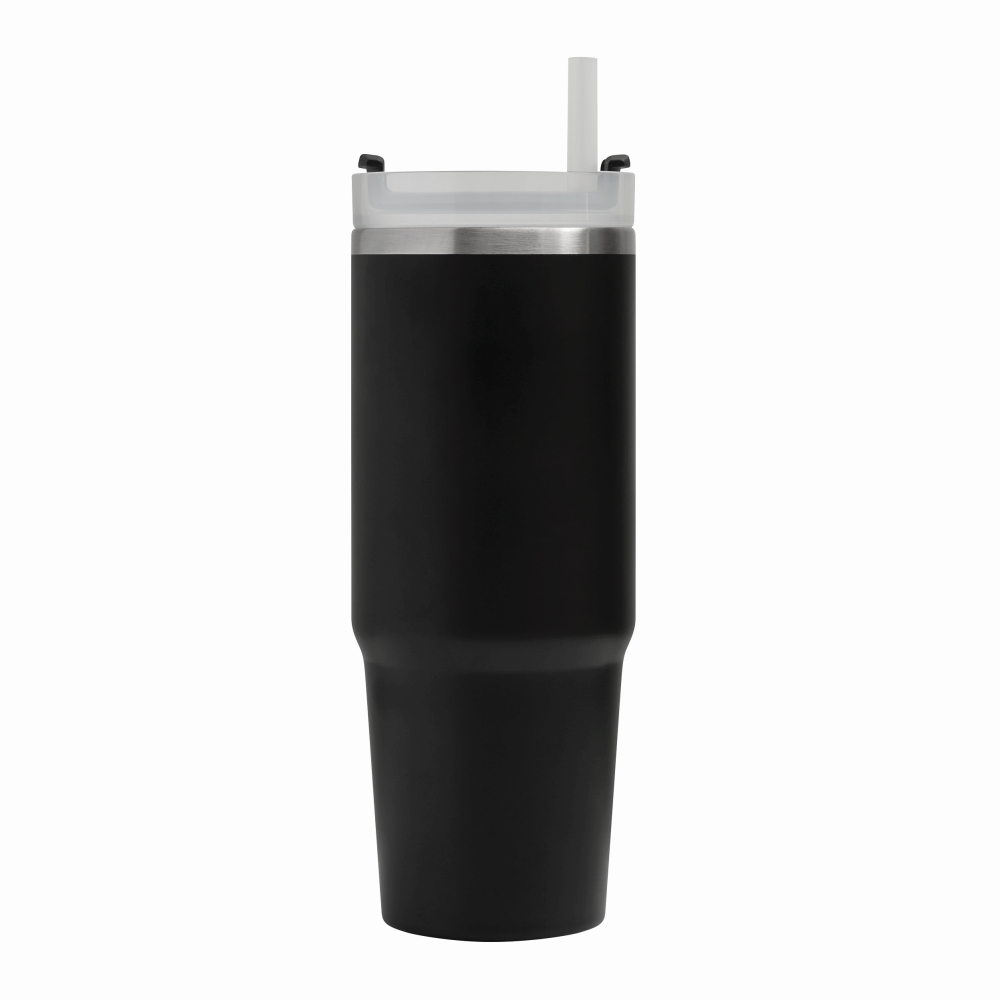Vakuový kelímek na pití z nerezové oceli, s praktickým držadlem, průhledným plastovým víčkem s bezpečným šroubovacím uzávěrem, silikonovým těsnícím kroužkem, otvorem na pití se šroubovacím uzávěrem a průhledným brčkem, objem 900 ml. Rozměry: o 8,8 x 24 cm