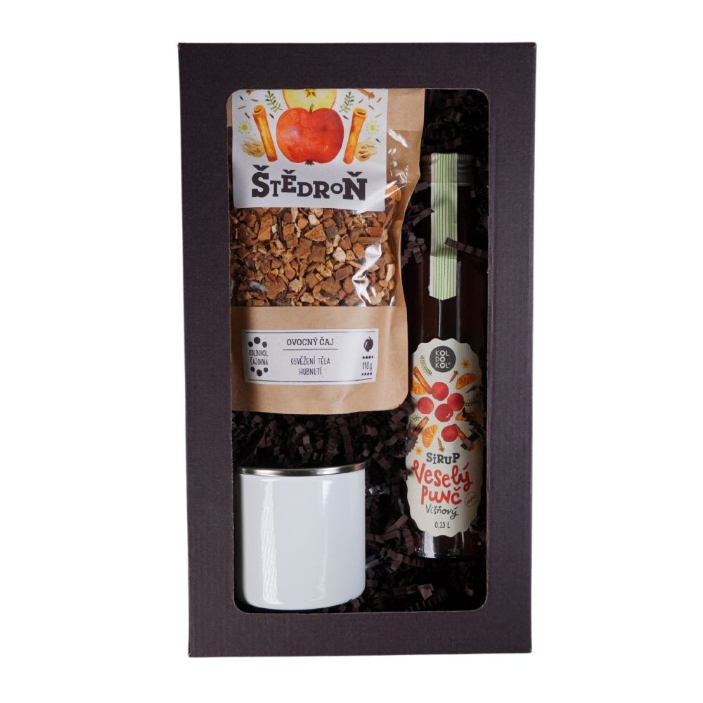 Sada obsahuje: - koncentorvaný sirup veselý punč 250 ml - sypaný čaj Štědroň 110 g - plecháček Sada je balena v dárkové krabici s víkem, která je vystlána barevnou papírovou výplní. Do krabice lze vložit komplimentku. Náhrada produktů vyhrazena dle dostupnosti. Termín dodání: 12-14 dnů. Minimální odběr: 24 kusů. Rozměry: 19 x 33 x 10 cm.