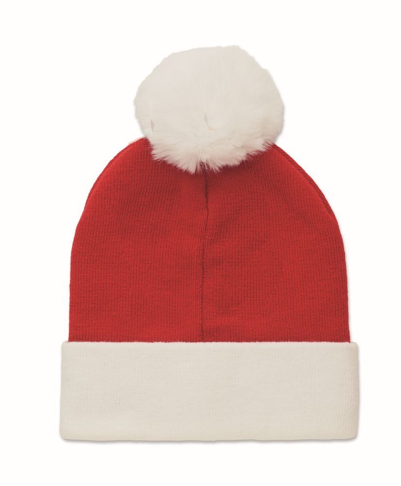 Vánoční pletená čepice s lemem a bambulí. Vyrobeno z PET polyesteru. Rozměry: 20x23cm