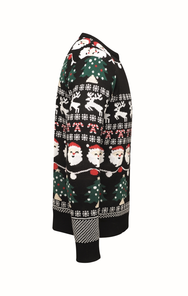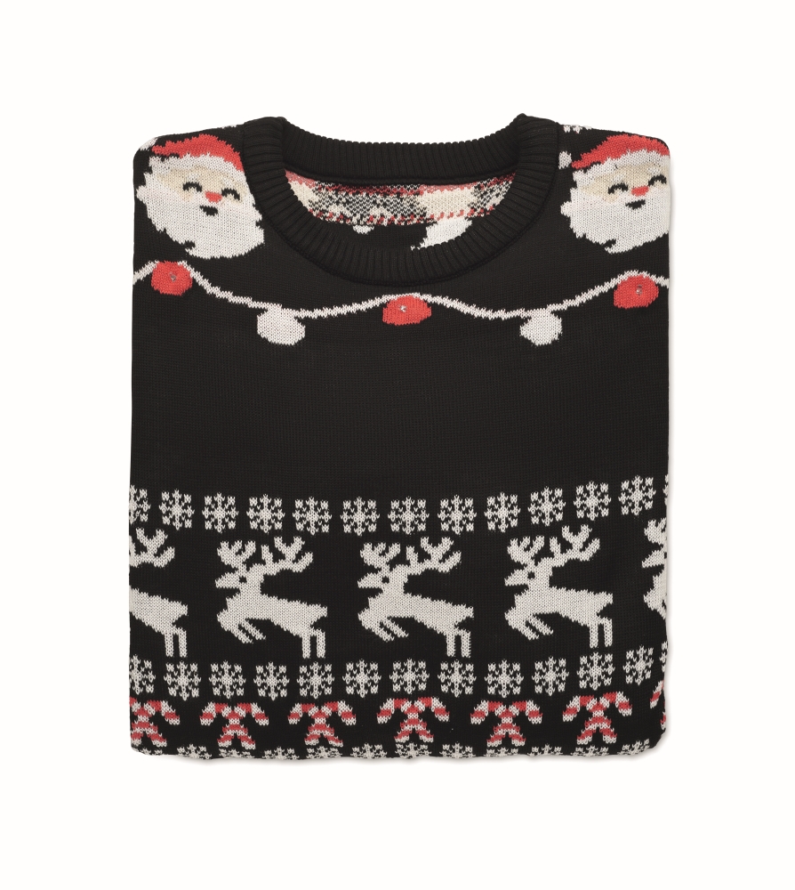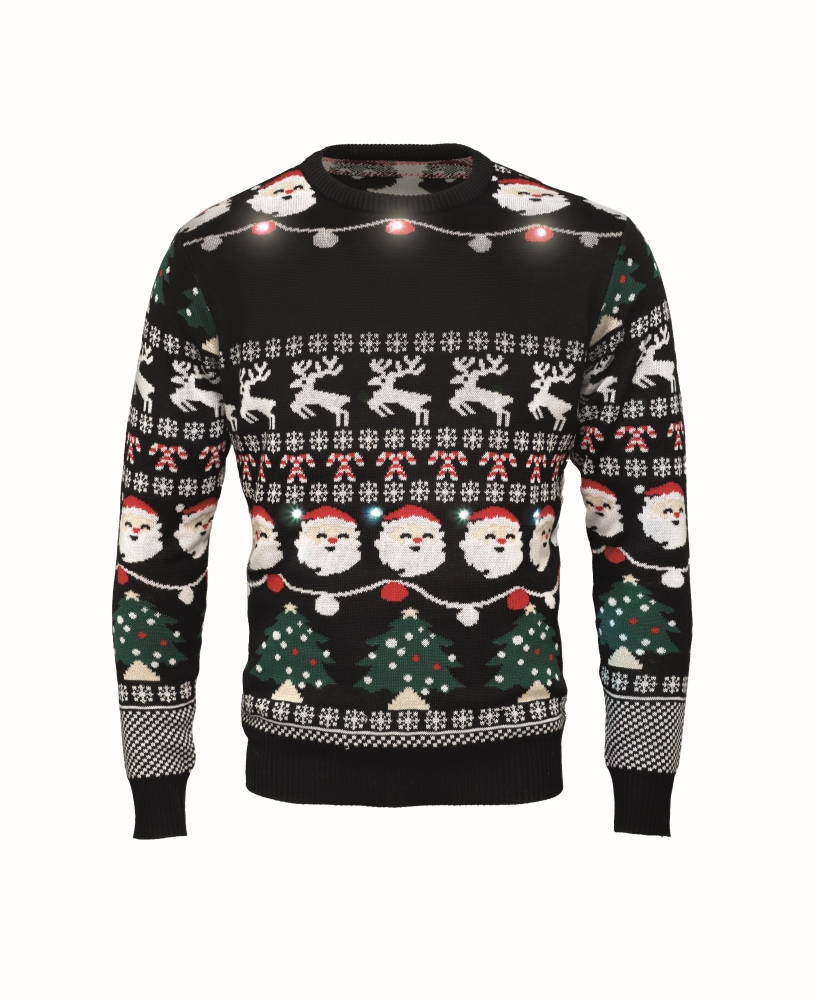 Vánoční svetr z akrylu s 10 LED světly. Velikost: S/M. Ukažte se v práci nebo na rodinné štědrovečerní večeři stylově v tomto svátečním svetru. Vyjímatelná přihrádka na baterie. Součástí balení jsou 2 baterie CR2032. Rozměry: 67 x 51 x 64 cm. Materiál: akryl