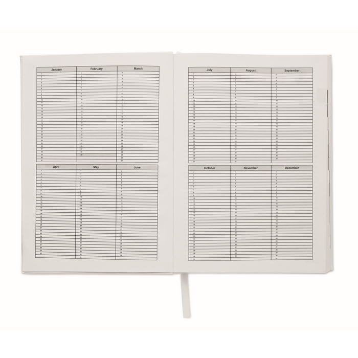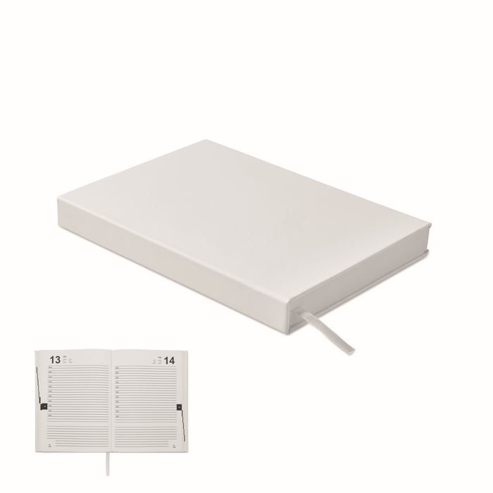 Věčný diář A5 s deskami ze 60 % z recyklovaného polyesteru a 40 % z PU. 416 univerzálních stran z recyklovaného 70g papíru (208 listů). S ladící barevnou polyesterovou záložkou.Rozměry: 15,4 x 21,4 x 2,5cm