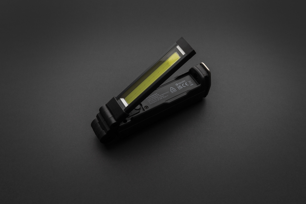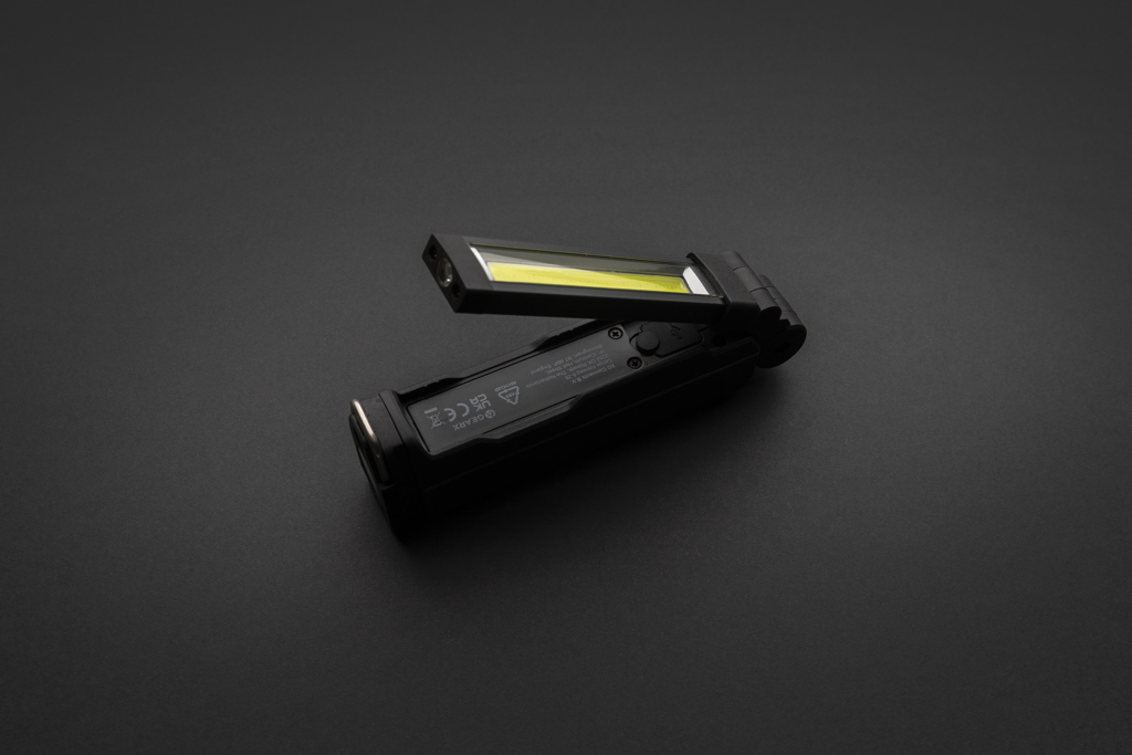 Opakovaně dobíjecí odolná pracovní svítilna. Obsahuje COB (600 lumenů) pro osvětlení blízkého prostoru a LED (200 lumenů) pro osvětlení vzdálenosti. 4 režimy: LED, COB, červené COB, SOS COB. Světlo lze otáčet ve 360°. Včetně magnetu a háčku na spodní straně. Zabudovaná 2 000 mAh baterie pro svícení po dobu až 3h na jedno nabití. Vyrobeno z RCS recyklovaného ABS plastu. RCS (Recycled Claim Standard) je globální standard, který umožňuje ověřit použití recyklovaného materiálu v produktu napříč celým dodavatelským řetězcem. Podíl použitého recyklovaného materiálu vzhledem k celkové váze produktu: 25 %. Včetně USB nabíjecí základny. Rozměry: 16 x 4.8 x 3.5 cm.
