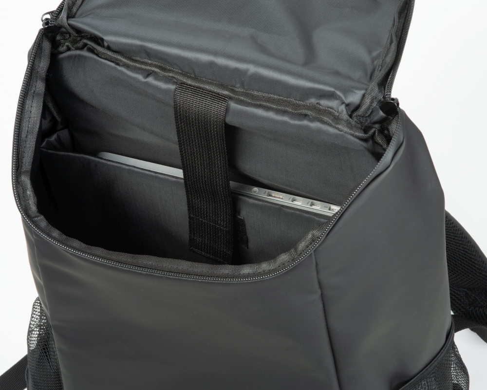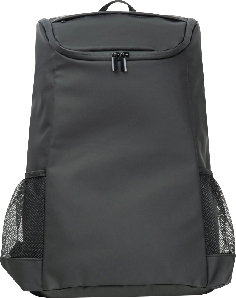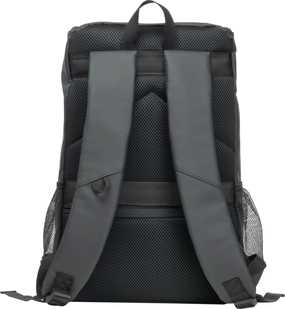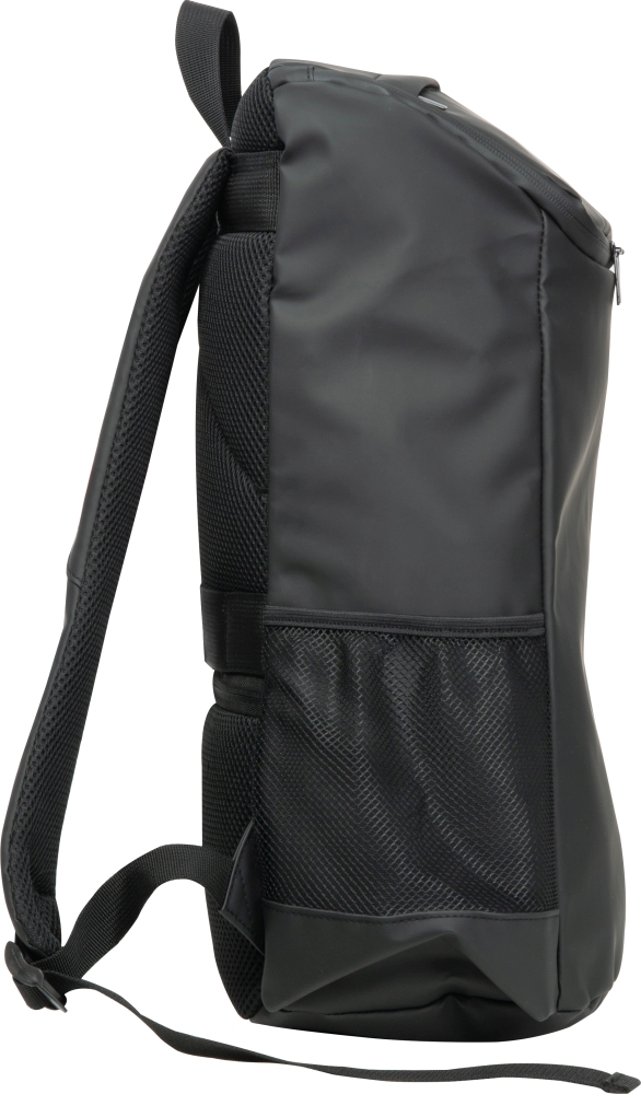 Velký batoh z umělé kůže s velkým úložným prostorem a kapsou na tablet. Lesklé zipy, dvě boční síťky na nápoje, tajná kapsa proti krádeži a polstrované ramenní popruhy. Rozměry: 34 x 16 x 46 cm