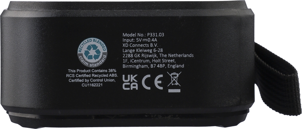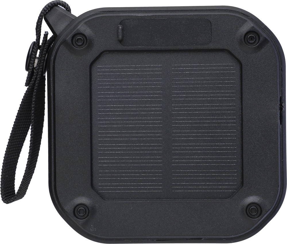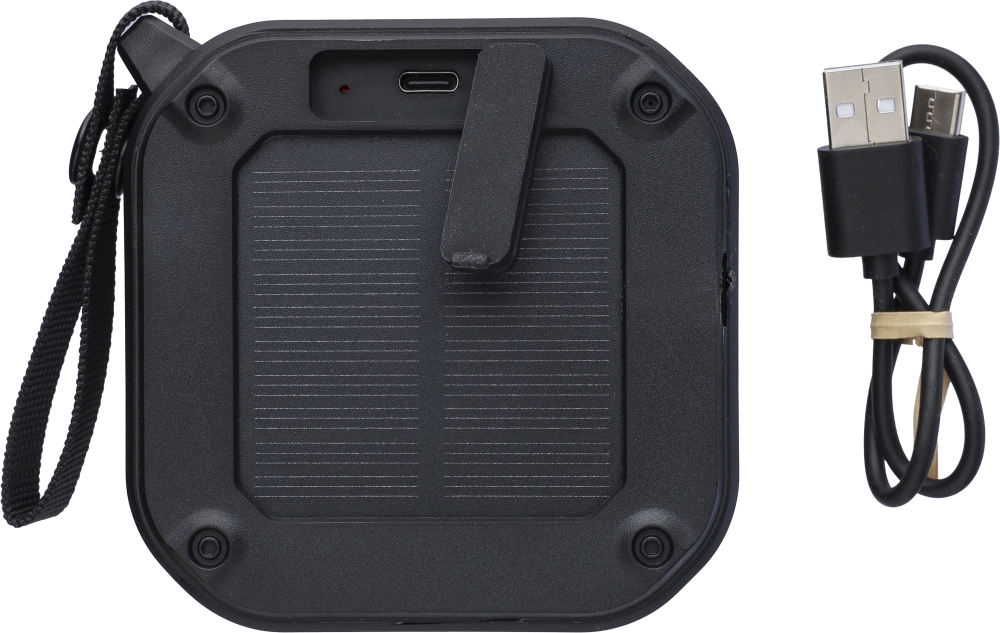 Recyklovaný venkovní reproduktor z ABS s páskem na zápěstí a karabinou. Stupeň krytí IPX6. 3W výstup, DC 5V vstup, 400mAh vestavěná dobíjecí baterie, s 4 hodinami přehrávání. Pracovní vzdálenost 15-20 metrů, odstup signálu od šumu 75 dB. Frekvenční rozsah: 100 Hz až 20 kHz. Obsahuje 30 cm nabíjecí kabel typu C, vestavěnou LED svítilnu (30 lumenů) a solární panel pro rozšíření použití. Technologie bezdrátového připojení: 5.3. Jednotlivě balené v hnědé kartonové krabici.Rozměry: 4,2 x 9,1 x 9,1 cm