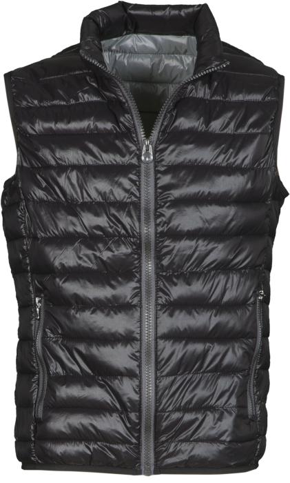 Pánská prošívaná vesta s šedou podšívkou, celopropínací, 2 vnější kapsy na zip, 2 vnitřní kapsy, 100% nylon s lesklou povrchovou úpravou, uvnitř polyester - imitace peří. Kovové zipy s pogumovaným povrchem. Doporučená technologie tisku: sítotisk S3, výšivka.