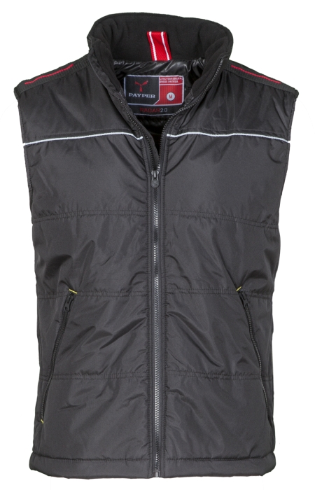 Pánská prošívaná vesta s podšívkou s reflexním páskem na hrudi a na zádech, dvěma velkými kapsami na zip a vnitřní kapsou. Materiál: pongee 100% polyester, 175grm.