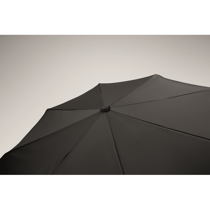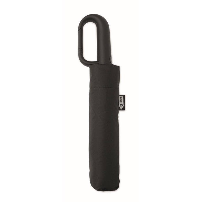 Skládací 21 větruodolný deštník s černě pokovenou tyčí. Sklolaminátová žebra. Panely z pongee 190T RPET. Rukojeť s karabinou a pogumovanou úpravou. Automatické otevírání a zavírání. Včetně pouzdra.Rozměry: O99,5 x 48cm