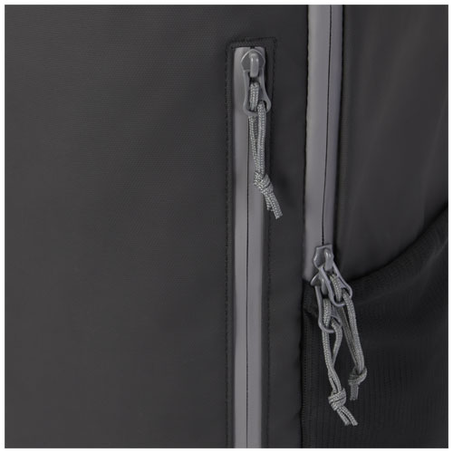 Voděodolný batoh na notebook vyrobený z GRS certifikovaných recyklovaných materiálů, včetně zipů. Obsahuje polstrovanou přihrádku na 15" notebook s bočním otvorem pro rychlý přístup, několik síťovaných kapes, přední kapsu na zip a reflexní lemování pro zviditelnění. Vytvarovaná a polstrovaná podložka a nastavitelný hrudní popruh umožňují pohodlné nošení i při plném naložení. Z recyklovaných materiálů GRS je vyrobena hlavní tkanina, podšívka, popruhy a zipy. Kapacita: 21 litrů. Neobsahuje PVC.