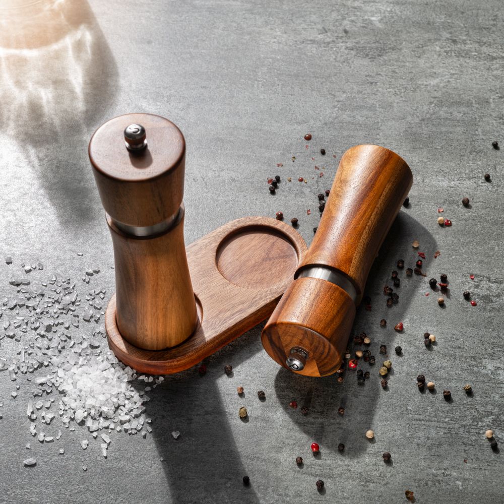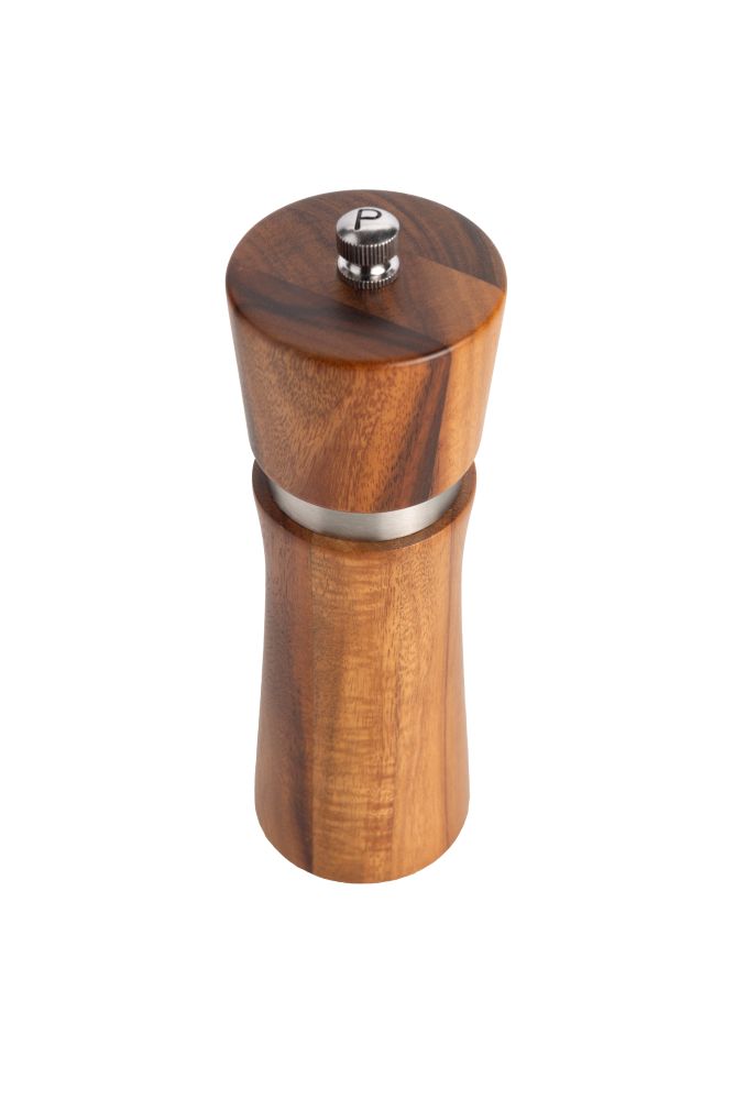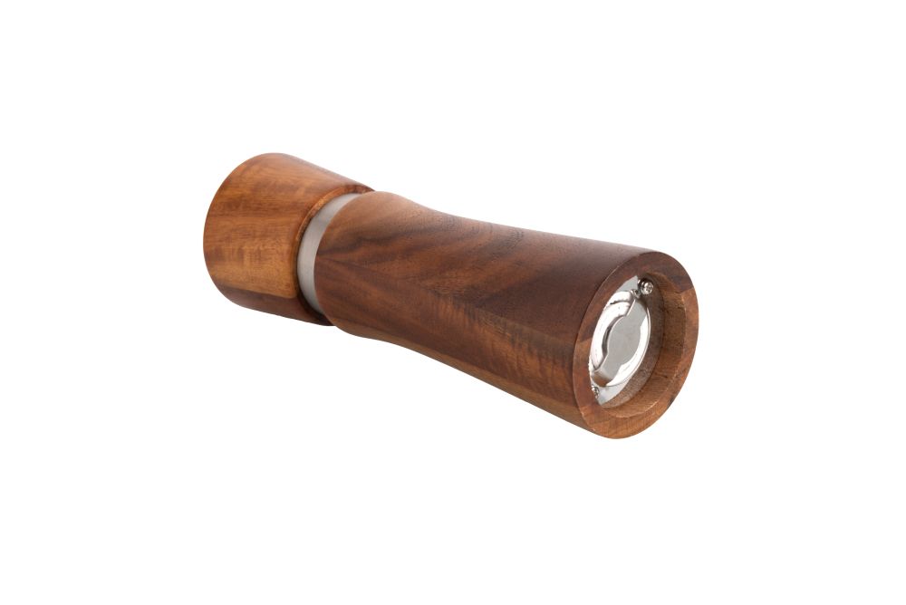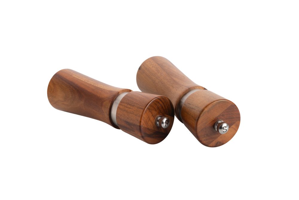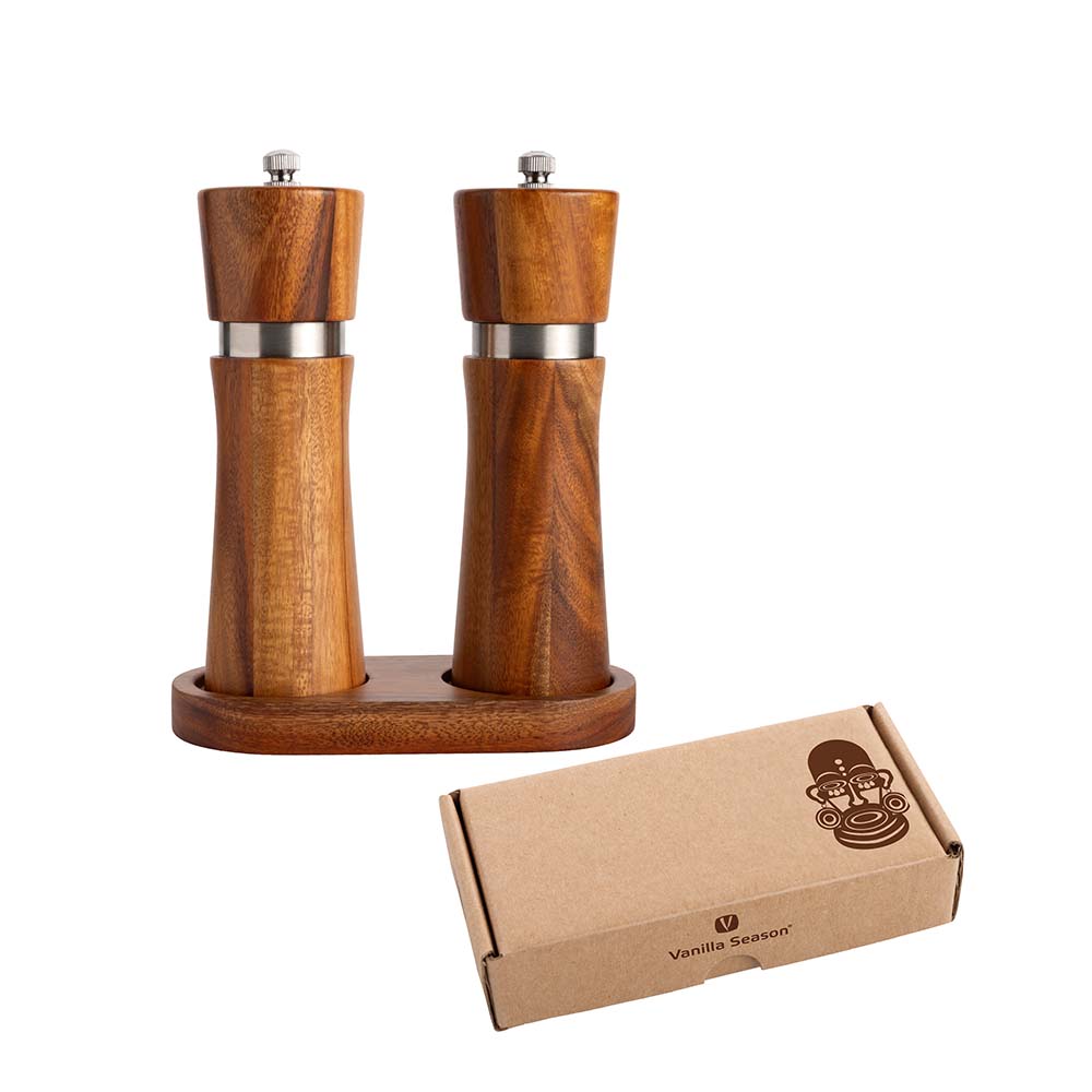 Elegantní sada mlýnků na pepř a sůl s podstavcem značky Vanilla Season. Mlýnky jsou vyrobeny z akáciového dřeva s nerezovým doplňkem. Mlecí kameny jsou keramické. Baleno v dárkové krabičce. Rozměry: včetně stojánku 14,2 × 17,5 × 6,8 cm, mlýnek O 5 × 16,5 cm, balení 11 × 17,5 × 8 cm. Uhlíková stopa: gCO2 e1816.