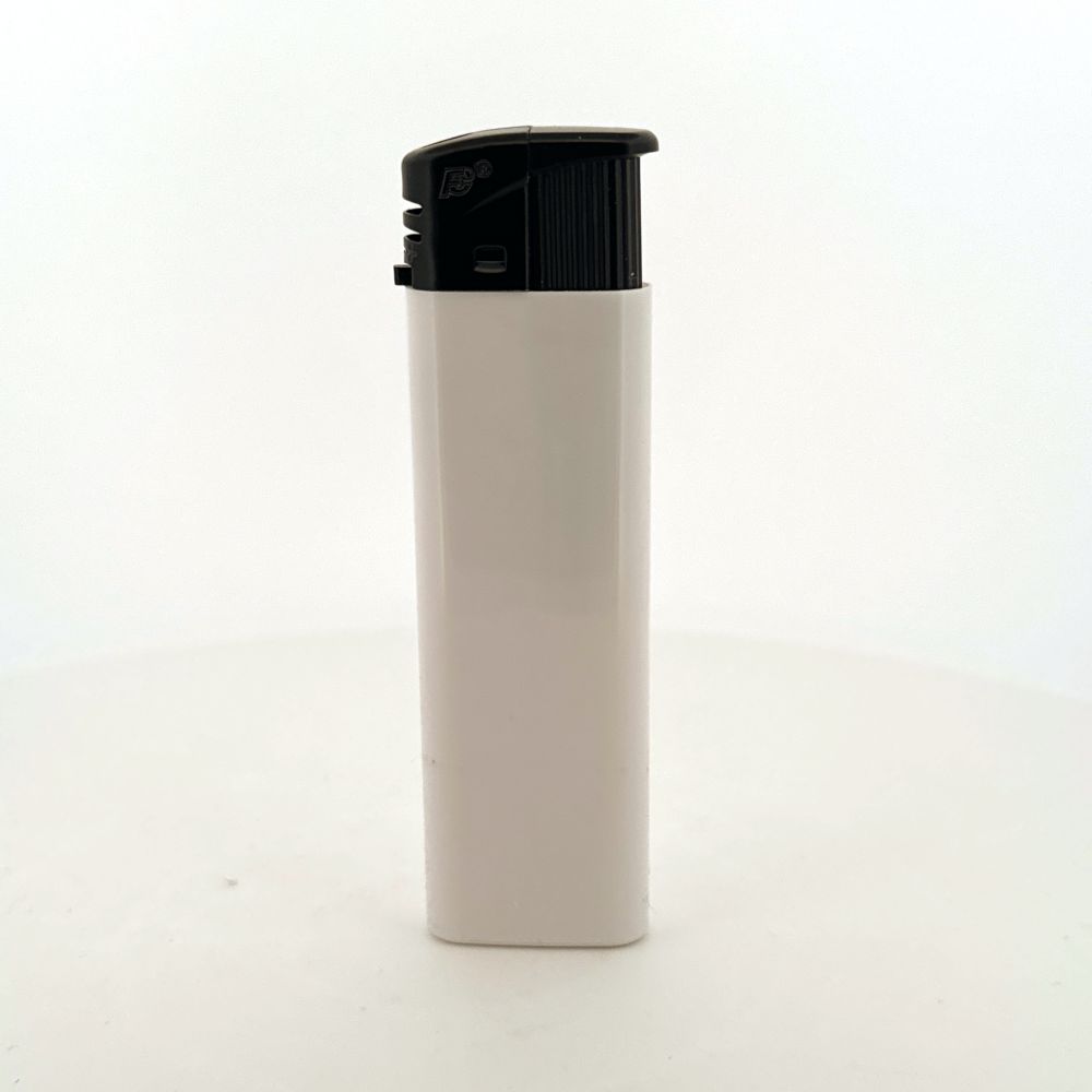 Plastový elektrický zapalovač, plnitelný, s možností regulace plamene. Rozměry: 8 × 2,6 × 1,1 cm.