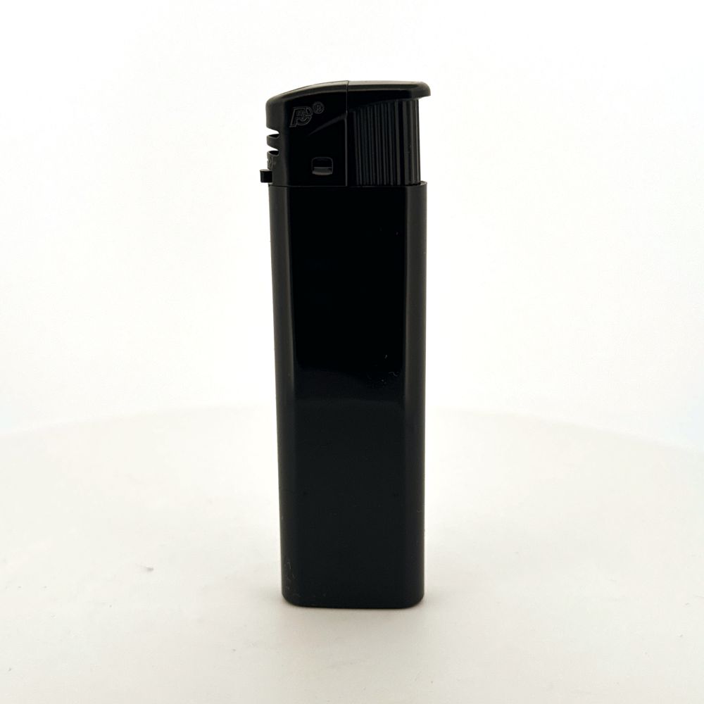 Plastový elektrický zapalovač, plnitelný, s možností regulace plamene. Rozměry: 8 × 2,6 × 1,1 cm.