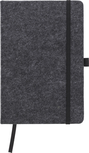 Zápisník velikosti A5 se 160 linkovanými stranami, poutkem na pero, záložkou a gumičkou k uzavírání. Desky zápisníku jsou potaženy RPET plstí. Rozměry: 21 x 14 x 1.8 cm