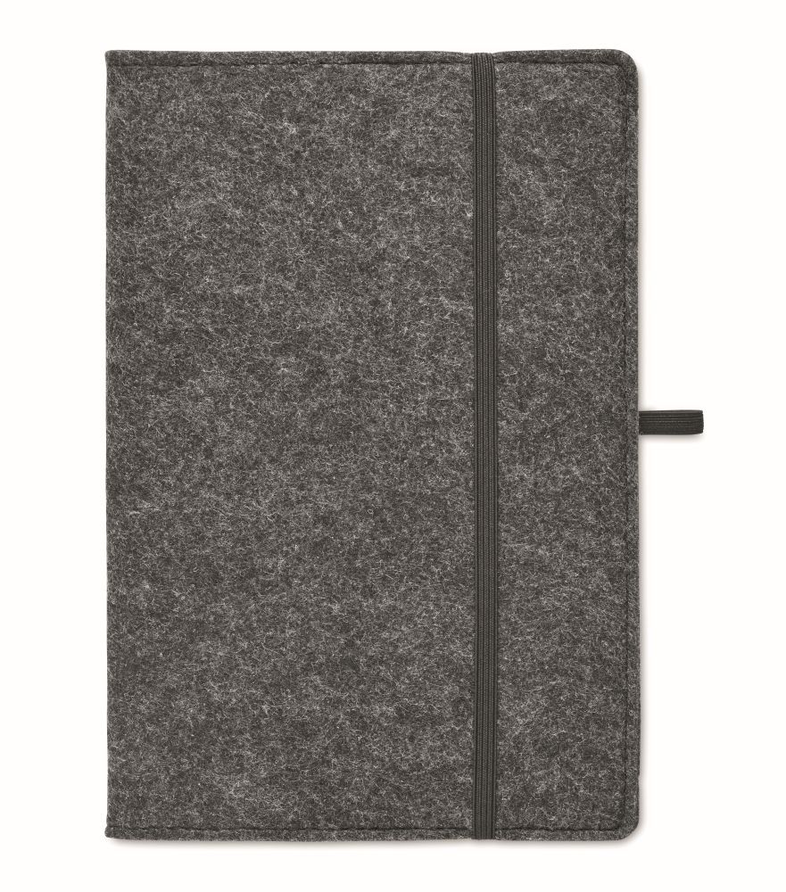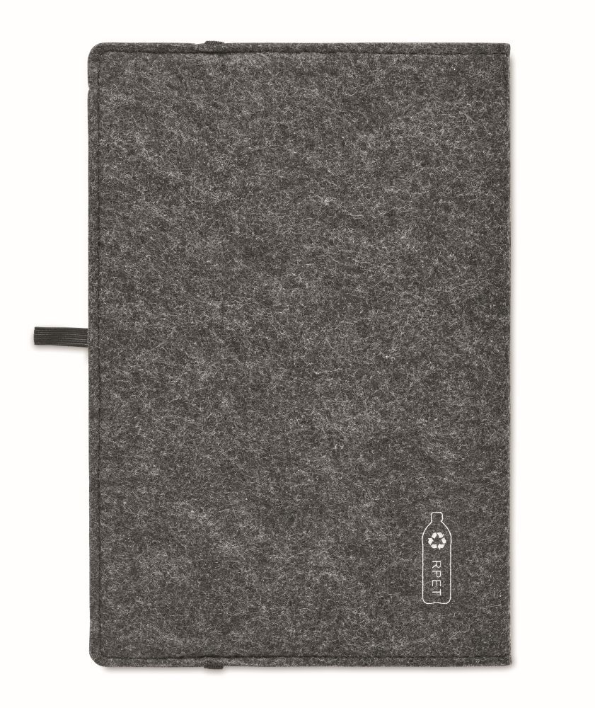 Zápisník A5 s plstěným obalem z RPET. 160 linkovaných stran (80 listů) z recyklovaného 70g papíru. Poutko na propisku. Rozměry: 15x22x1.6cm