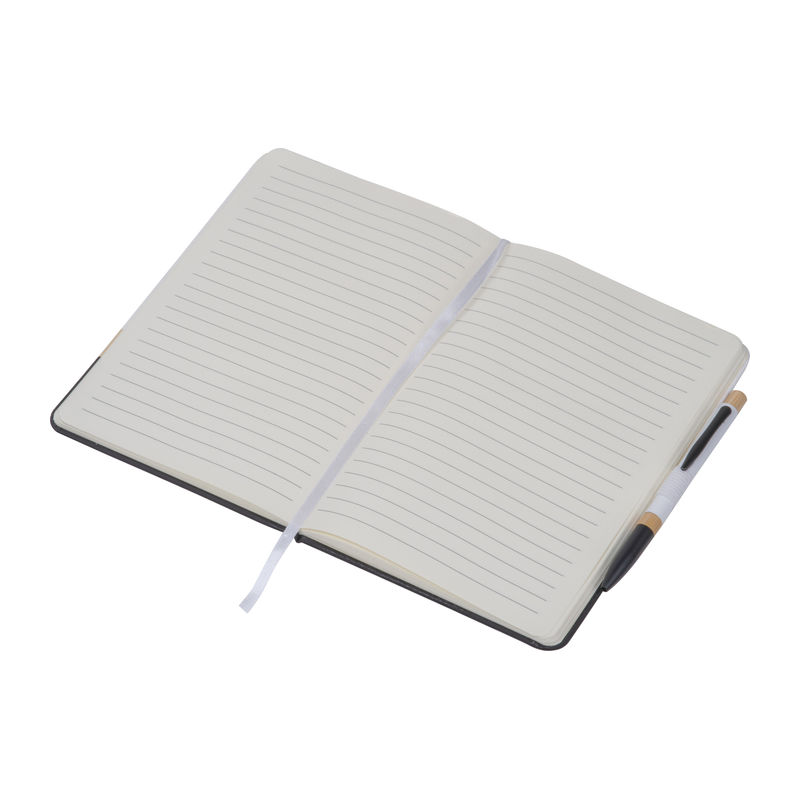 Zápisník A5 s propiskou. Zápisník je vyrobený z recyklovaného papíru se 160 linkovanými stranami, bambusu a PU. Propiska ve stejném dizajnu, z hliníku a bambusu. Rozměry: 14,5 x 1,5 x 21 cm