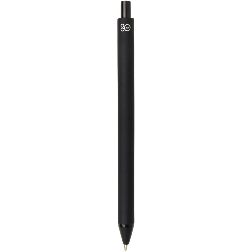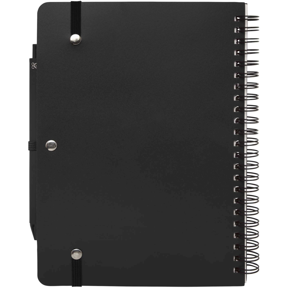 Zápisník formátu A5 s pevnou obálkou je vyroben z recyklovaného plastu, který by jinak skončil v oceánu, s 80 linkovanými listy papíru v krémové barvě o gramáži 70 g/m2. Zápisník má zaoblené rohy, elastické zavírání a poutko na pero. Propiska s černým inkoustem je také vyrobena z recyklovaného plastu z oceánu. Délka psaní: 1000 metrů. Rozměr hrotu: 1,0 mm. Rozměry: 21 x 14,5 cm