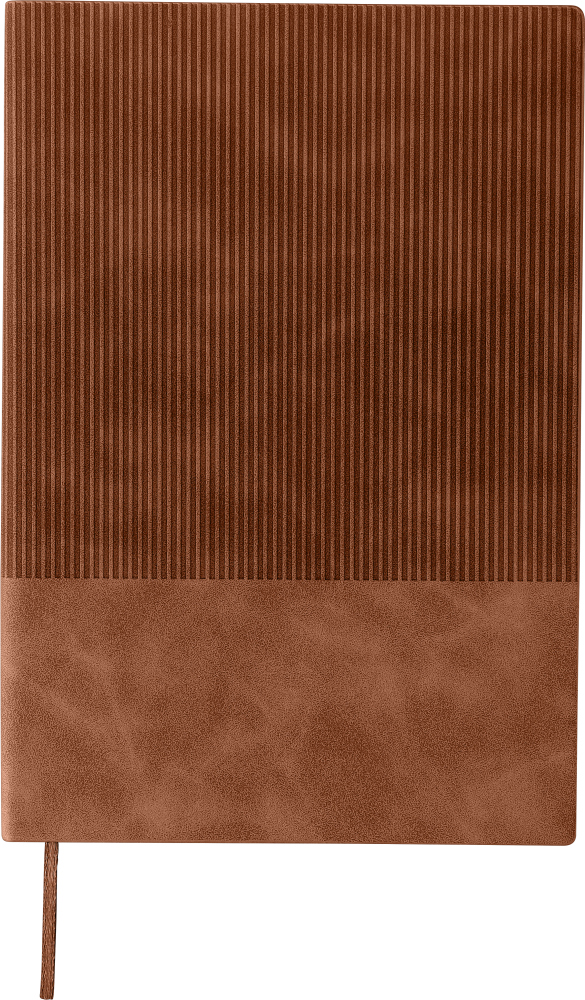 Recyklovaný PU zápisník (cca A5) s tvrdou vazbou a manšestrovou úpravou na horní části přední a zadní strany. Součástí je záložka se stuhou a 100 linkovaných stránek (80 g/m2). Na zadní straně je vyražené recyklované logo. Rozměry: 20,8 x 14,4 x 1,3 cm