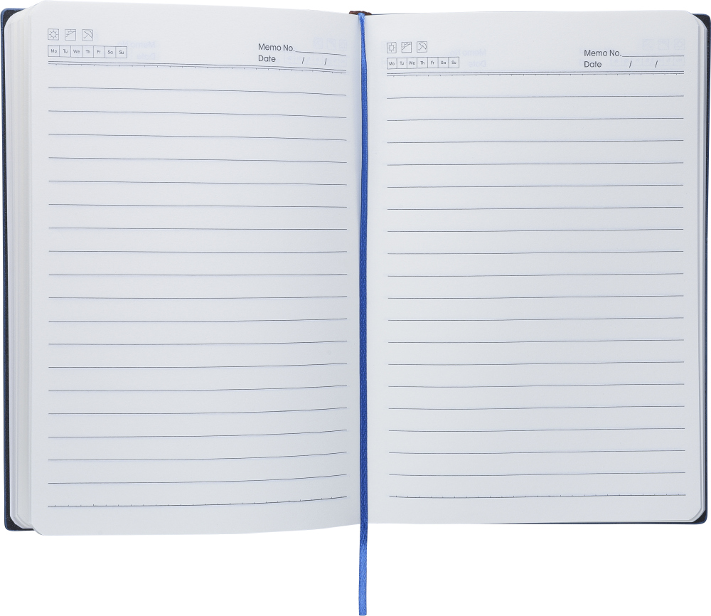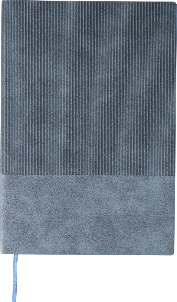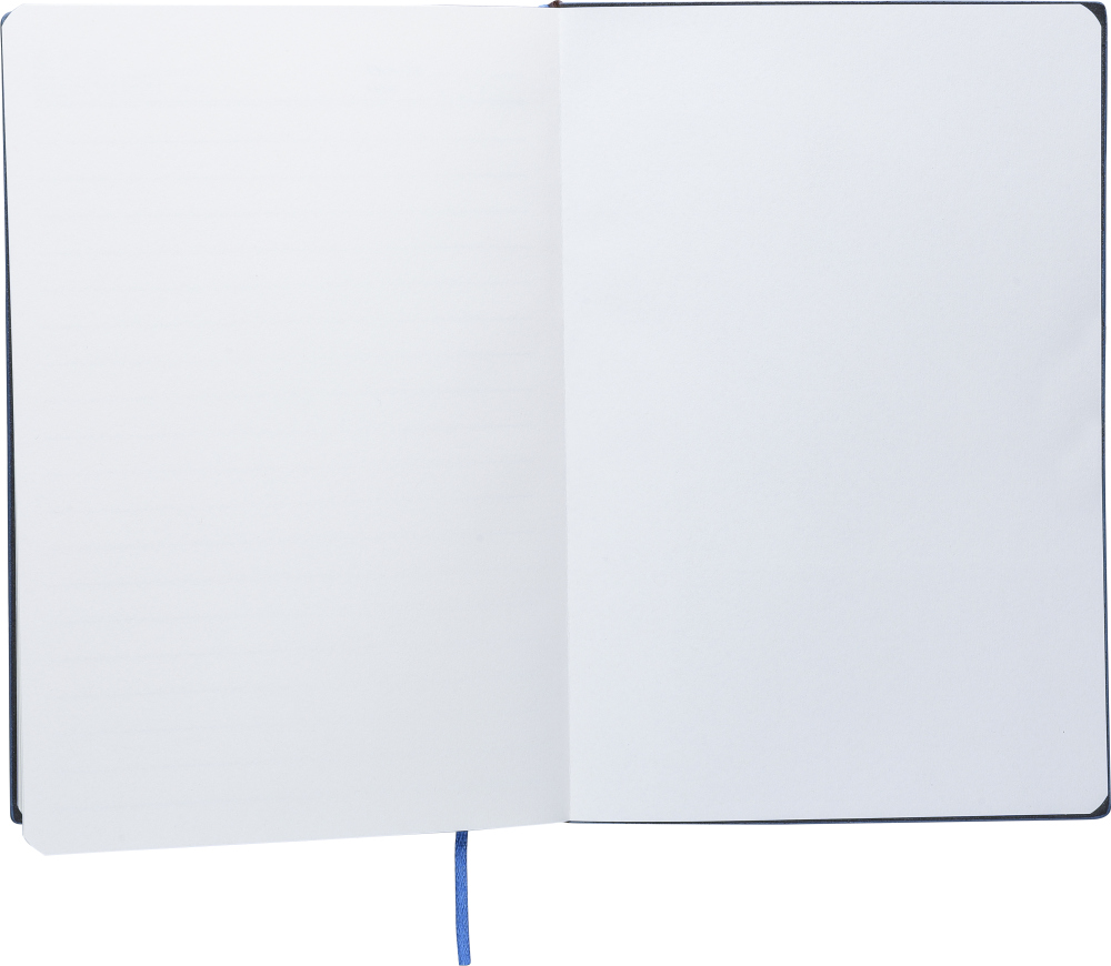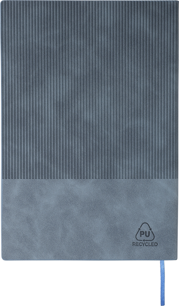 Recyklovaný PU zápisník (cca A5) s tvrdou vazbou a manšestrovou úpravou na horní části přední a zadní strany. Součástí je záložka se stuhou a 100 linkovaných stránek (80 g/m2). Na zadní straně je vyražené recyklované logo. Rozměry: 20,8 x 14,4 x 1,3 cm