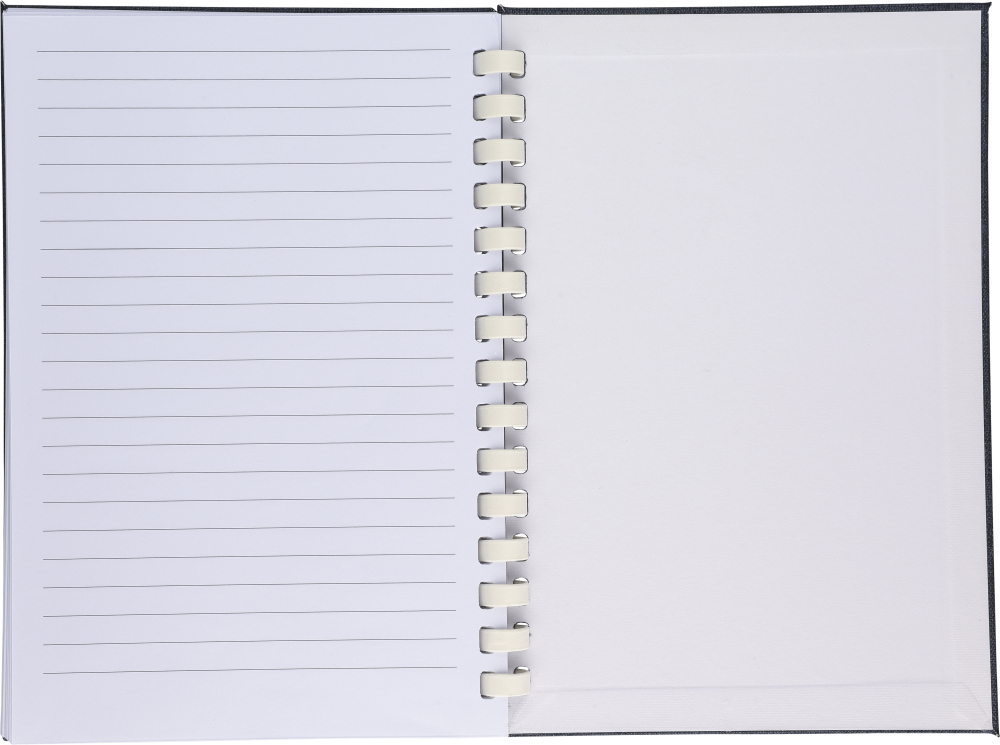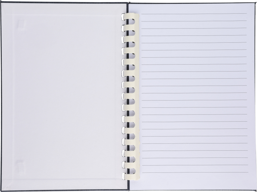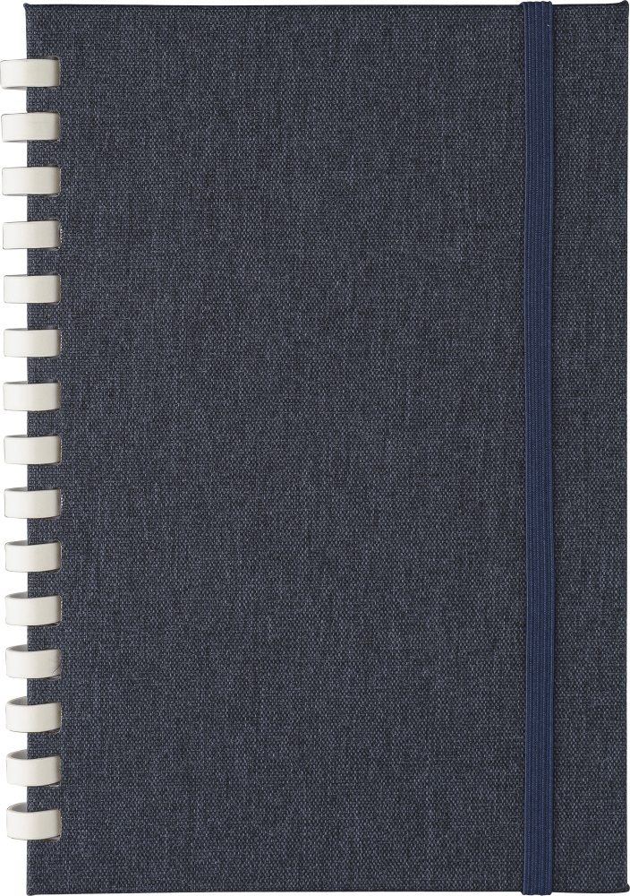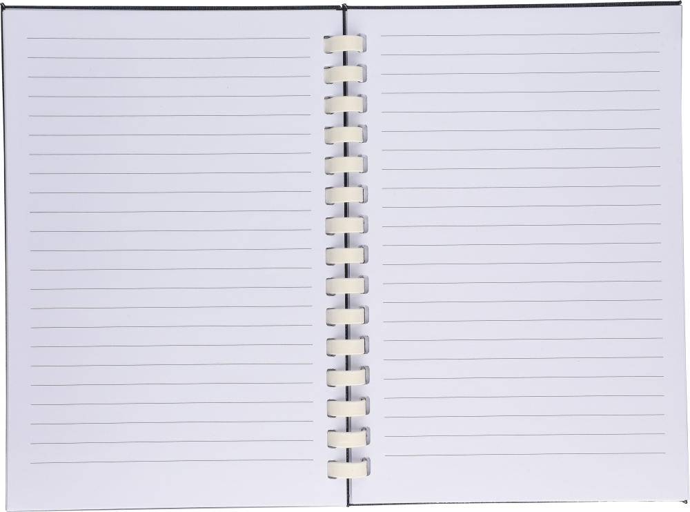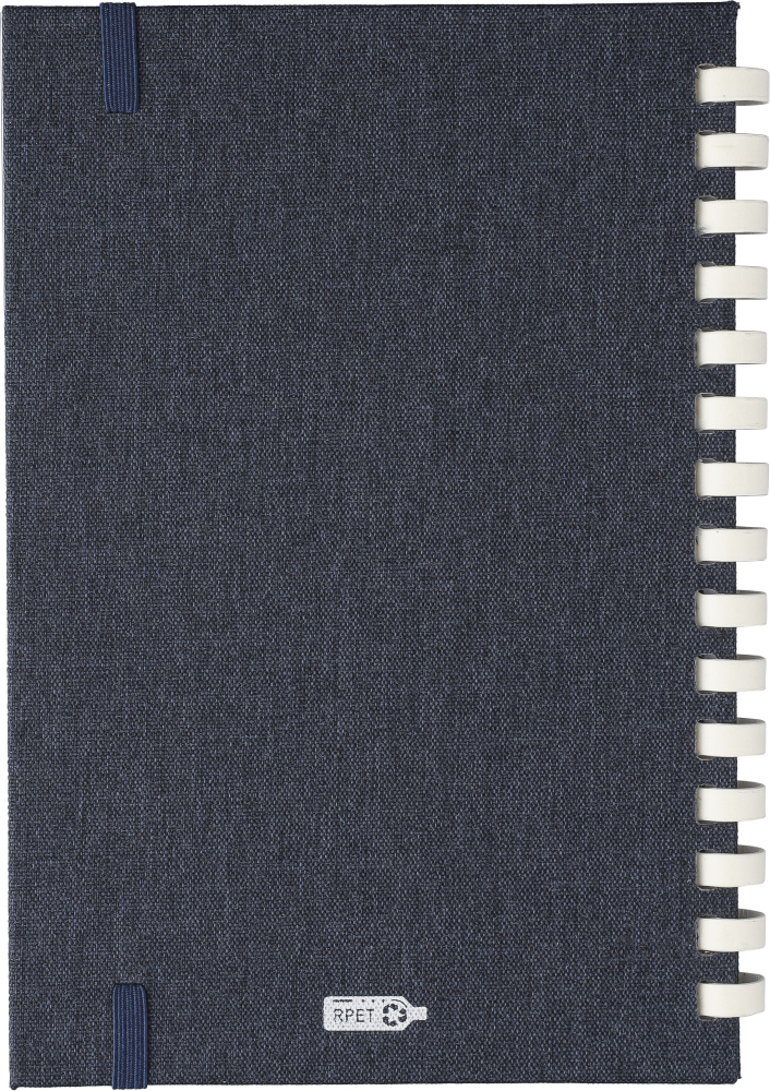 Zápisník z rPET (cca A5) s tvrdou deskou a elastickým uzavíracím páskem. Obsahuje bílou kartonovou spirálu (15 kroužků), záložku se stuhou a 80 listů (70 g/m2) s linkovaným papírem. Na zadní straně je logo rPET. Zabaleno v hedvábném papíru, bez polybagu. Rozměry: 21 x 14,5 x 0,8 cm