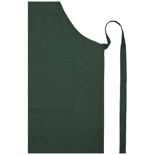 Udržitelná zástěra z certifikované organické bavlny a gramáží 200 g/m2. Má 2 kapsy umístěné vedle sebe o celkových rozměrech 45 x 20 cm a pásky na zavázání o délce 1 m. Délka popruhu kolem krku: 55 cm. Rozměry: 100 x 70 cm