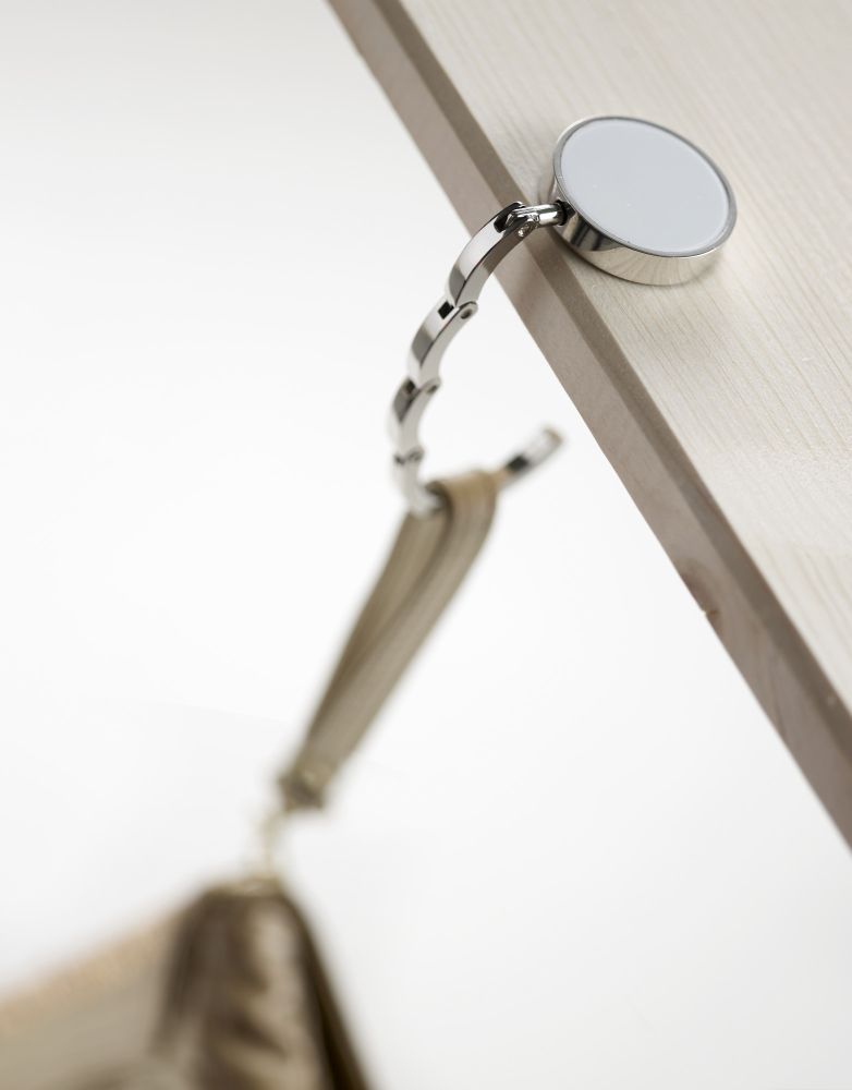 Skládací kovový háček na kabelku, který snadnopověsíte na stůl nebo bar. Kabelku tak mátepo ruce a nemusíte ji mít na zemi nebo židli. Rozměry: o 4,4 × 0,5 cm.