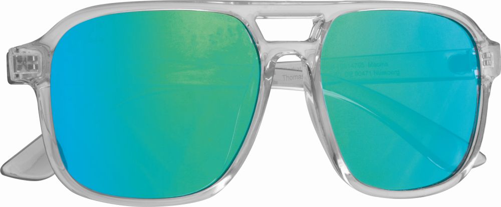 Sluneční brýle s průhledným rámem z RPET a s barevnými sklíčky. Filtr kategorie 3 a UV400. Rozměry: 14,5 x 15 x 5,2 cm