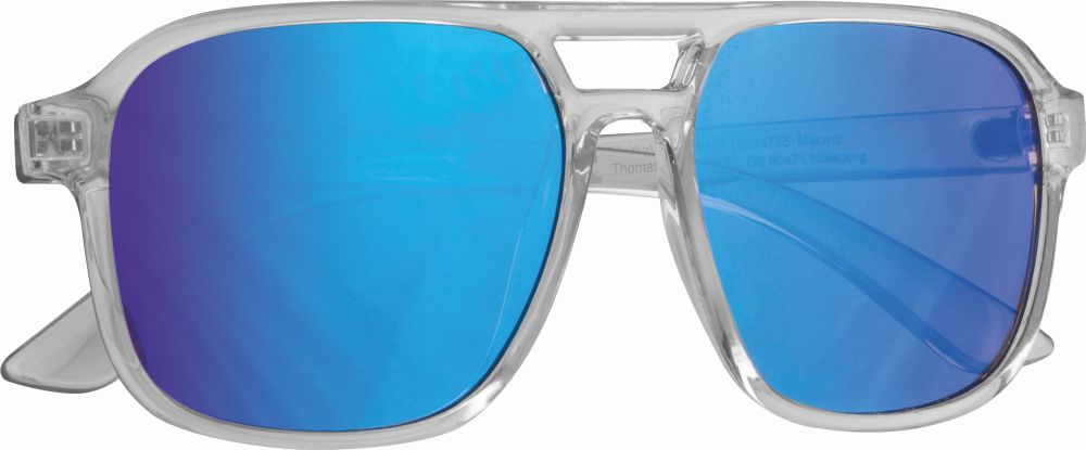 Sluneční brýle s průhledným rámem z RPET a s barevnými sklíčky. Filtr kategorie 3 a UV400. Rozměry: 14,5 x 15 x 5,2 cm