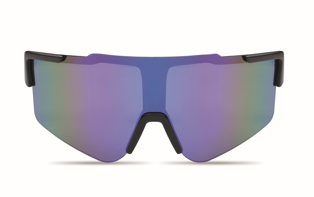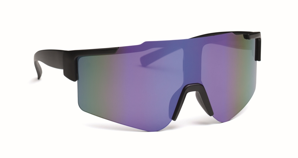 Sportovní sluneční brýle s černými obroučkami a zrcadlovými skly. Ochrana UV400. Rozměry: 14 × 5 ,5 × 12 cm.